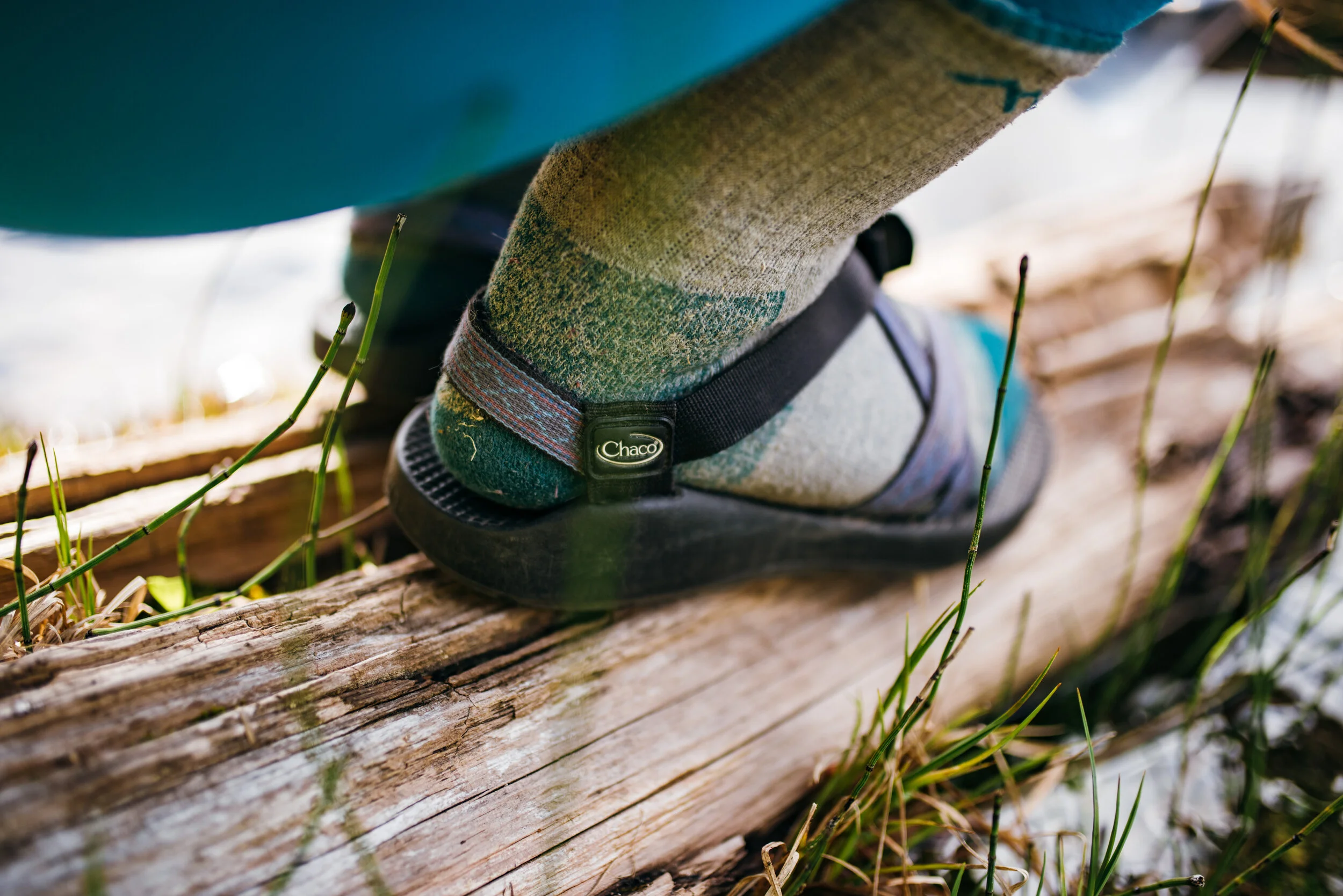 Person wearing socks with sandals, stepping on a wooden log outdoors.